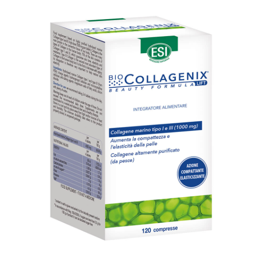 Biocollagenix 120 compresse -integratore alimentare pensato per supportare l’elasticità della pelle e il benessere delle articolazioni, grazie alla presenza di collagene marino idrolizzato di tipo I e III purificato (1000 mg per compressa).